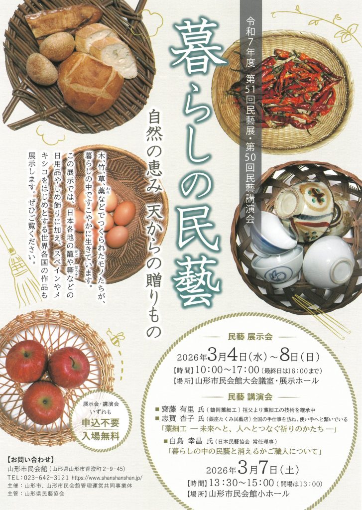 「藁細工―未来へと、人へつなぐ祈りのかたち―」 講師 齋藤有里氏(鶴岡藁細工)、志賀杏子氏(銀座たくみ民藝店) 「暮らしの中の民藝と消えるかご職人について」 講師 白鳥幸昌氏(日本民藝協会 常任理事)