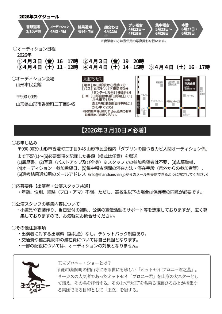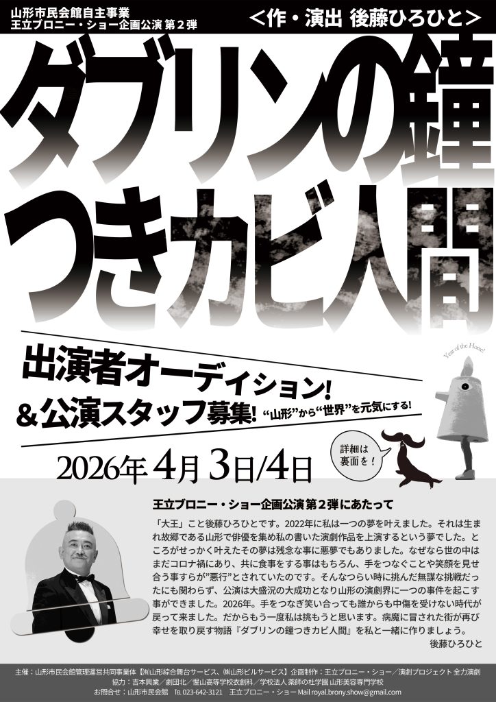 このたび、令和8年6月27日(土)~28日(日)に開催する、山形市民会館自主事業 王立ブロニー・ショー企画公演「ダブリンの鐘つきカビ人間」について、作品を共に作り上げる一部出演者・スタッフを募集いたします。